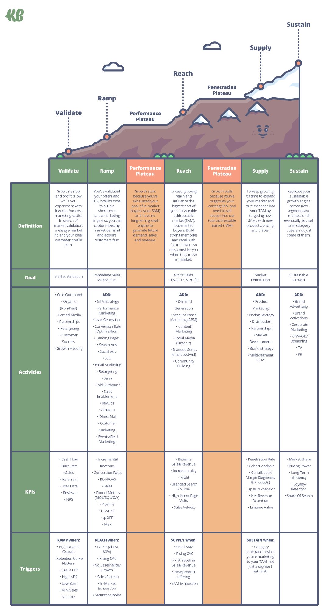 We created our Marketing Maturity MountainTM, a sustainable growth framework that, for the first time, plots the five core maturity stages a business and its marketing must go through to increase market penetration and sustain growth over the long term, in order to address almost EVERY problem a marketer faces, regardless of the stage the company is in.